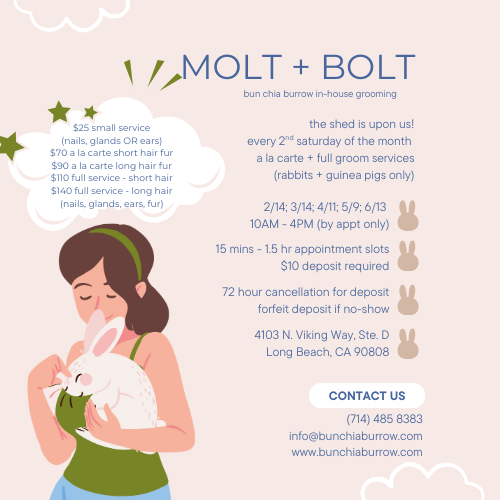 We will pamper your rabbit/s for an hour and a half, so you don't have to groom for another 4-8 weeks. All services can be scheduled à la carte or as a complete spa package.