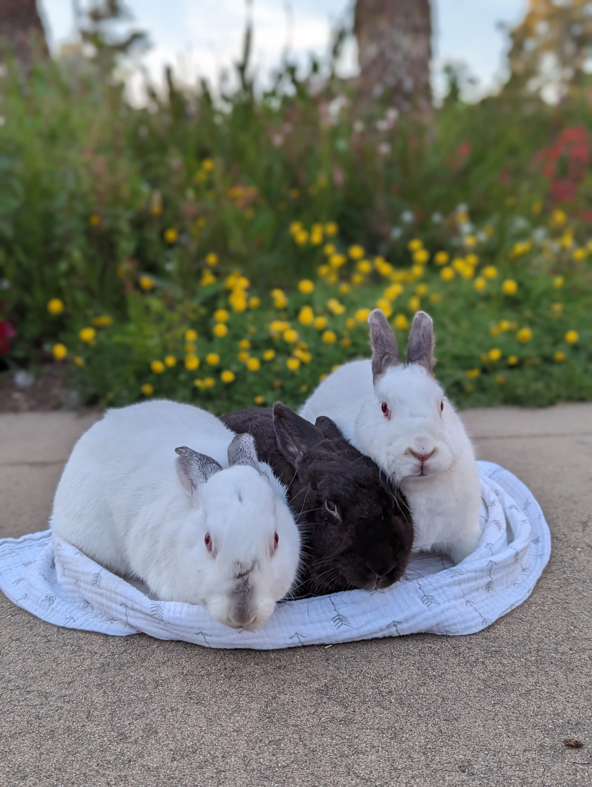We adopted Macaron from Friends of Unwanted Rabbits in Folsom, CA in December 2020, and Chocolatte (and Charlotte🌈) from Bunny World Foundation in Los Angeles, CA in July 2021. The trio are 100% free-roam, litter trained, trick-trained, and bonded to each other. We cannot imagine having only one rabbit after watching the way these three take care of each other. Their bond showed us something special—and other rabbit rescue volunteers encouraged us to share what we learned with the community.